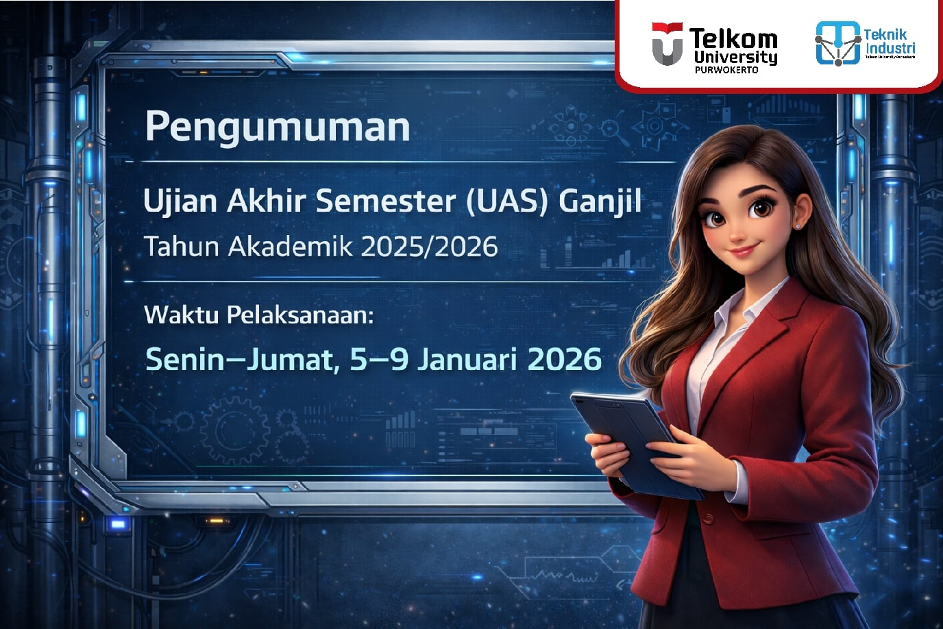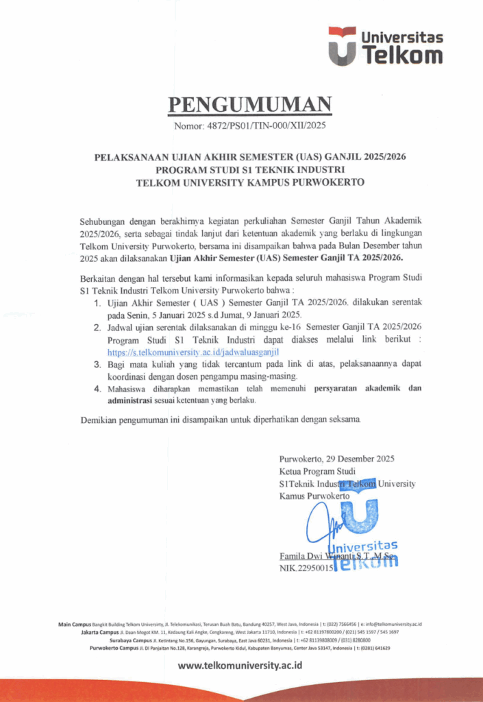 Dalam rangka pelaksanaan evaluasi pembelajaran pada Semester Ganjil Tahun Akademik 2025/2026, Universitas mengumumkan bahwa Ujian Akhir Semester (UAS) akan diselenggarakan pada Senin–Jumat, 5–9 Januari 2026.